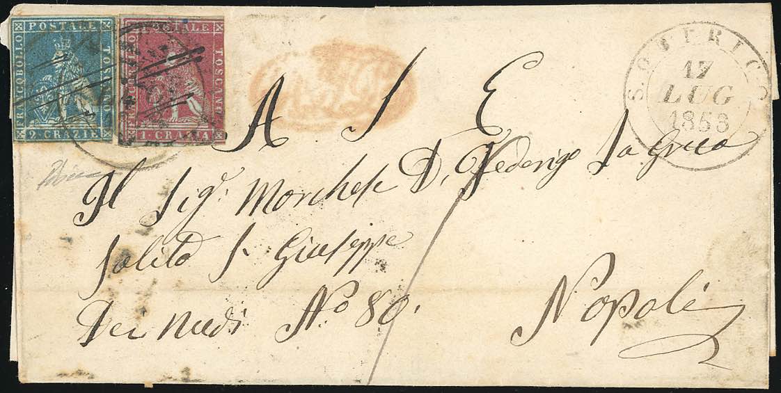 SAN QUIRICO, doppio cerchio grande + penna combinazione non catalogata - 1 crazia, 2 crazie (4d,5d), difetti, su sovracoperta di lettera del 17/7/1853 per Napoli, via di terra, al verso lineare "transito per lo Stato Pontificio". Rara ed inedita combinazione di coannullatori.