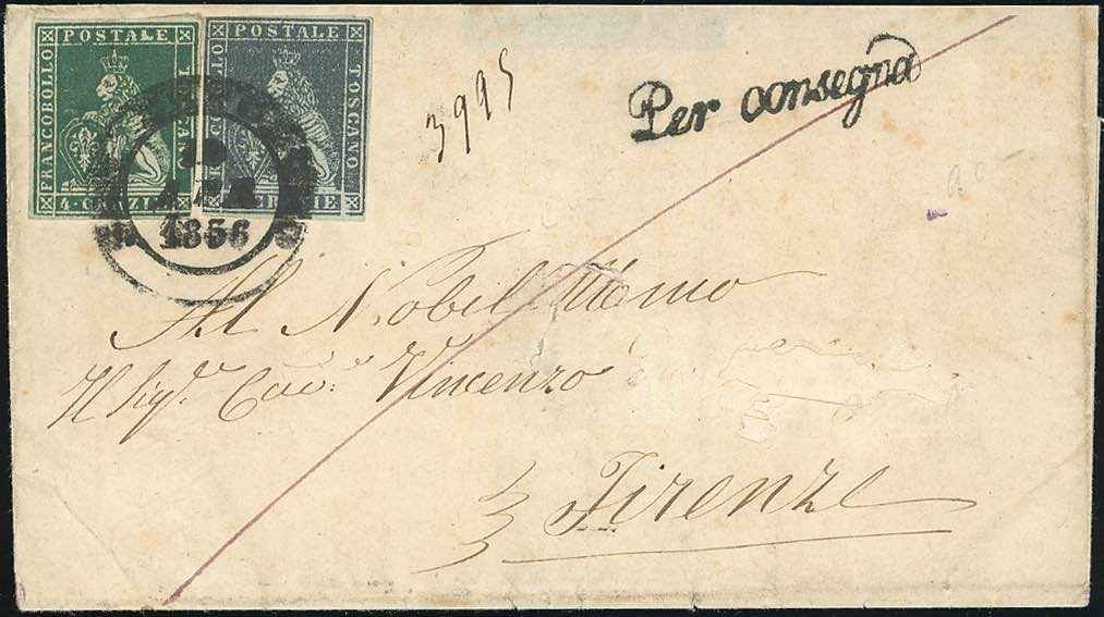 SAN SEPOLCRO, doppio cerchio grande + PER CONSEGNA non catalogato - 4 crazie, 6 crazie (6,7), lievi difetti di marginatura, su sovracoperta di lettera raccomandata, senza il lembo superiore e con indirizzo parzialmente asportato, del 10/4/1856 per Firenze. Bollo accessorio non riportato sul catalogo Sassone.
