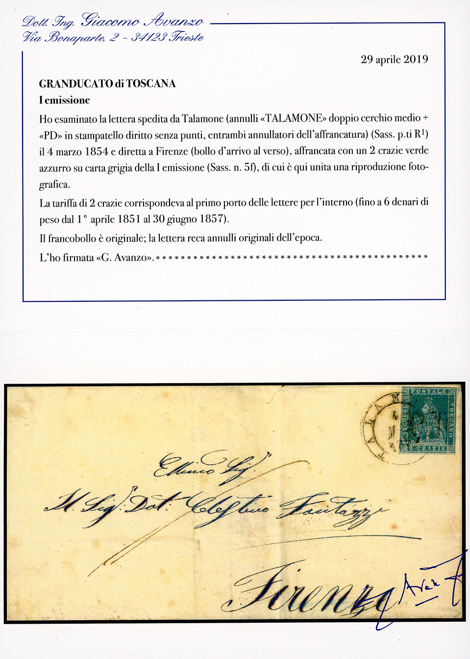 TALAMONE, doppio cerchio medio + PD coannullatori punti R1 - 2 crazie (5f), due margini leggermente sfiorati, su sovracoperta di lettera del 4/3/1854 per Firenze. Combinazione di annulli ad oggi inedita, unica nota! Cert. Avanzo.
