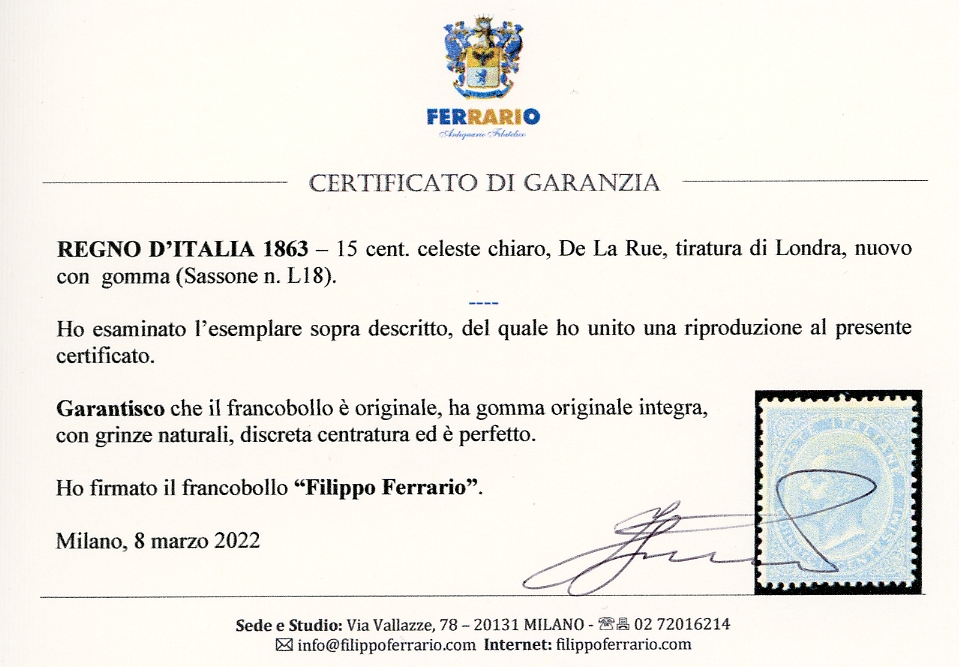 1863 - 15 cent. De La Rue (L18), discreta centratura, grinze di gomma naturali, gomma originale integra, perfetto. Sassone, cert. Ferrario.
