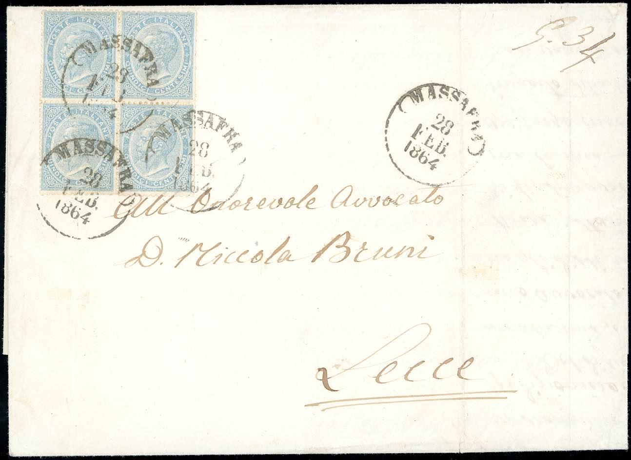 1864 - 15 cent. De La Rue (L18), blocco di quattro, lieve piega verticale su due esemplari, su lettera da Massafra 28/2/1864 a Lecce. Rara, ottimo aspetto.