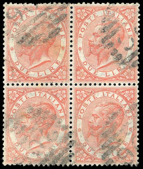 1863 - 2 lire De La Rue, tiratura di Torino (T22), blocco di quattro esemplari usati, perfetto. Raro! Cert. Diena.