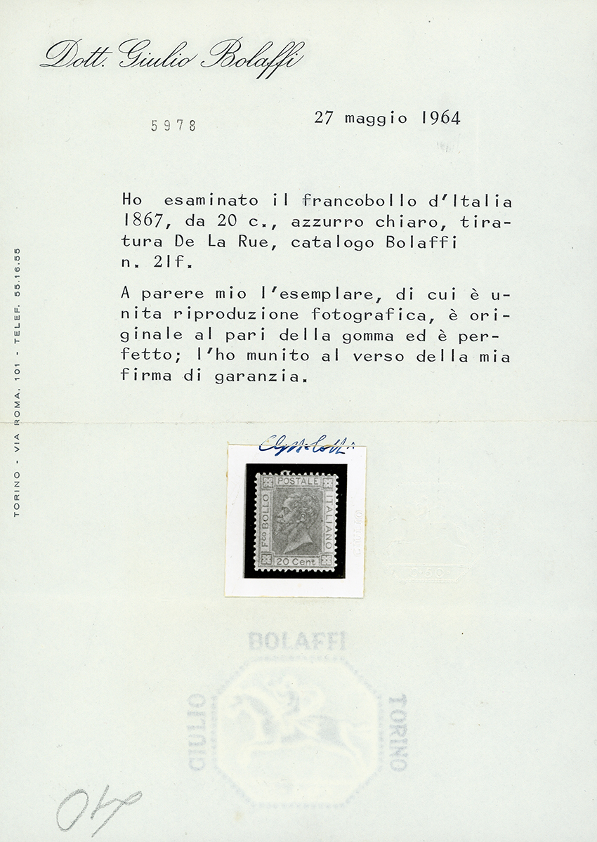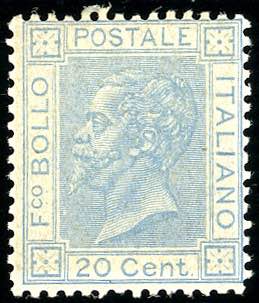 1867 - 20 cent. celeste chiaro, tiratura di Londra (L26), discreta centratura, gomma originale, leggerissima traccia di linguella, perfetto. A.Diena, cert. G.Bolaffi.