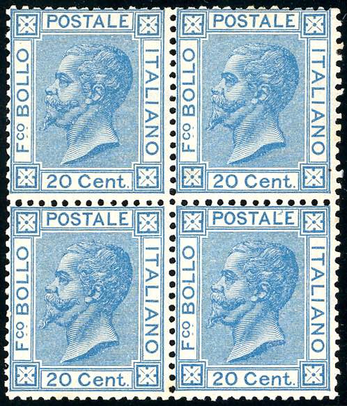 Lot 997 - 1867 - 20 cent. azzurro, tiratura di Torino (T26), blocco ...