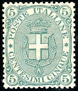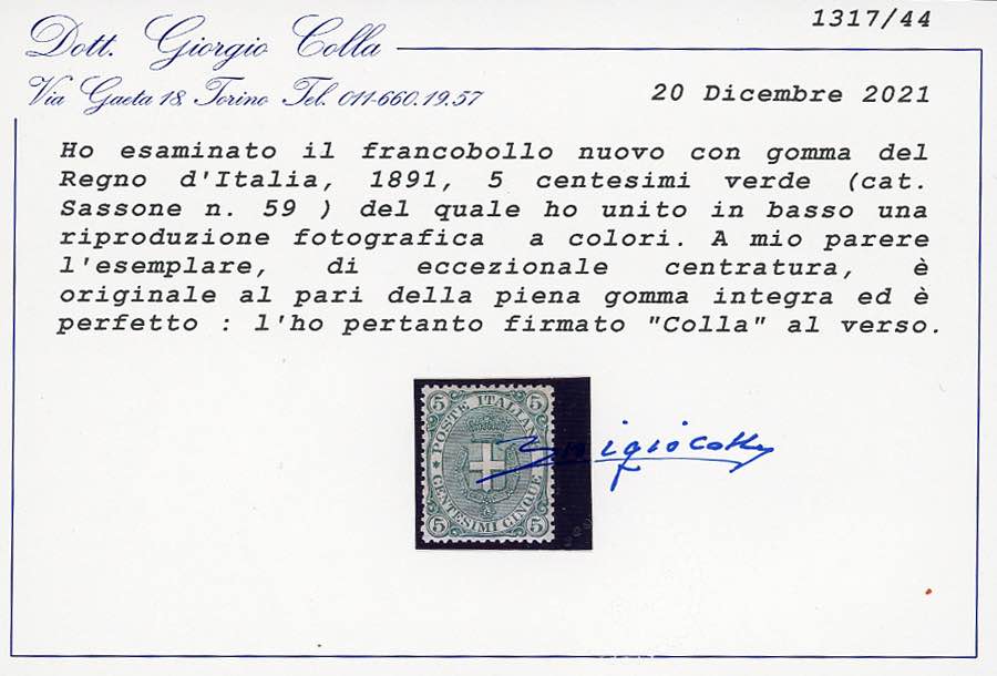 1891 - 5 cent. Stemma (59), centratura eccezionale, gomma originale integra, perfetto. Splendido! G.Bolaffi, A.Diena, cert. Colla.