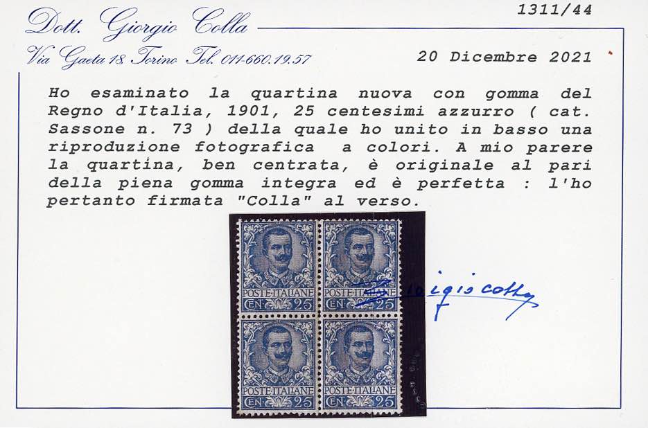 1901 - 25 cent. Floreale (73), blocco di quattro, due esemplari di ottima centratura, due di buona/ottima, gomma originale integra, perfetto. Molto bello. A.Diena, cert. Colla.