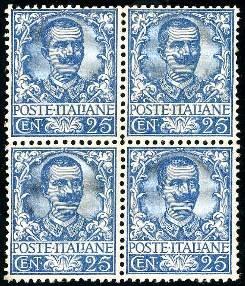 1901 - 25 cent. Floreale (73), blocco di quattro, due esemplari di ottima centratura, due di buona/ottima, gomma originale integra, ... Read more
