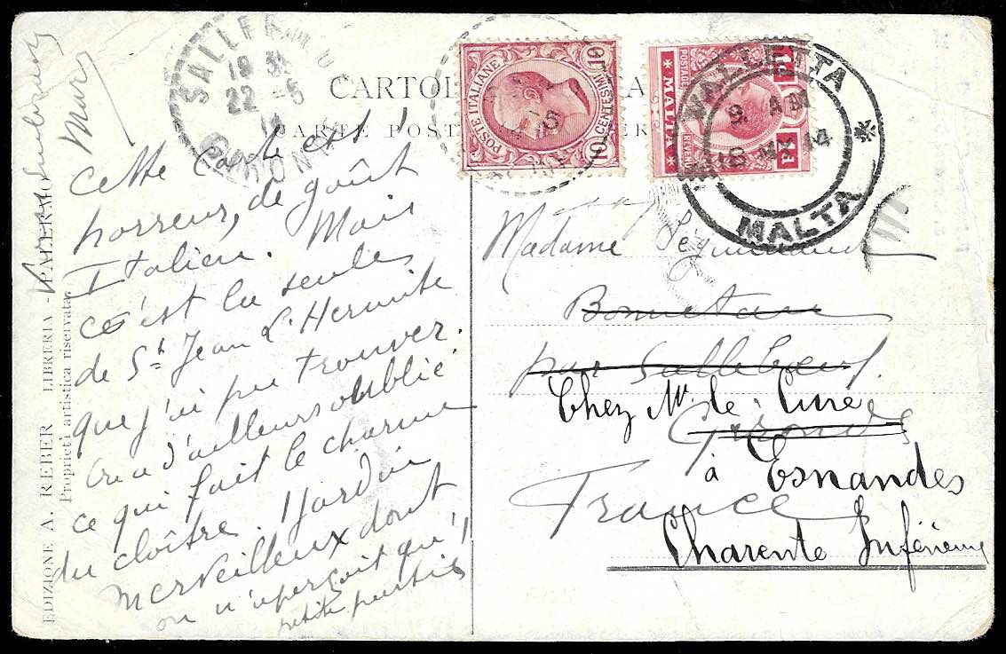 1914 - 10 cent. Leoni (82), perfetto, non annullato in partenza, su cartolina da Palermo, riaffrancata con 1 p. Giorgio V (Malta 44) annullata a Valletta 18/5/1914 per Sallerbeuf Gironne, dove è stato annullato il francobollo italiano, rispedita ad Esnades. Bella mista di rispedizione. A.Bolaffi