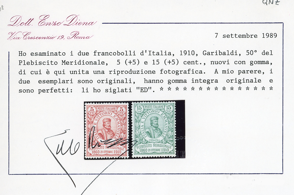 1910 - Garibaldi (87/90), ben centrati, gomma originale integra, perfetti. Belli. Cert. Diena per i n. 89/90.