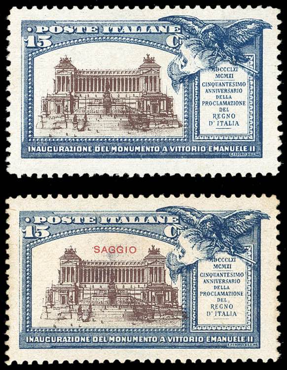 1911 - Inaugurazione del Vittoriale nel 50° anniversario dell'Unità d'Italia, saggio Federici senza la dicictura "saggio" (Unificato 105c), gomma originale, perfetto. Raro. Cert. Ferrario. Allegato analogo esemplare con la dicitura "saggio" in rosso.