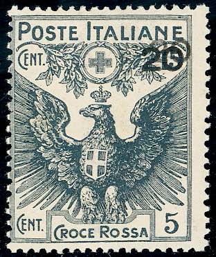 1916 - 20 cent. su 15 + 5 cent. Croce Rossa, doppia soprastampa (104b), gomma integra, perfetto. Emilio Diena, G.Bolaffi, cert. Diena.