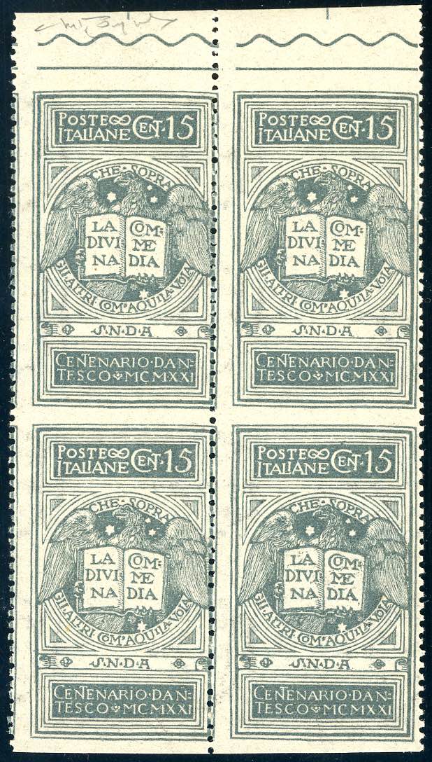 Lot 1109 - 1921 - 15 cent. grigio Dante, non emesso, blocco di quattro ...