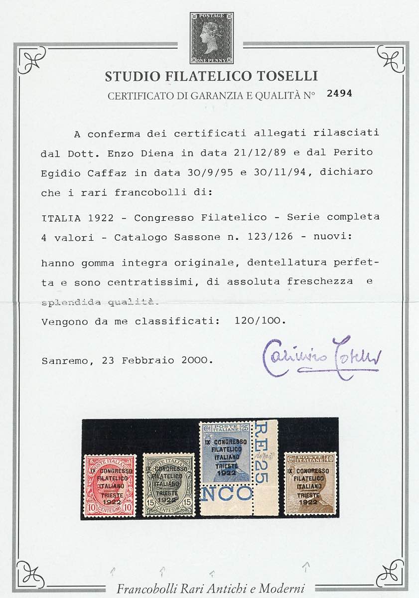 1922 - Congresso Filatelico (123/126), centratura eccezionale, gomma originale integra, perfetti. Splendidi e molto rari di questa ... Read more