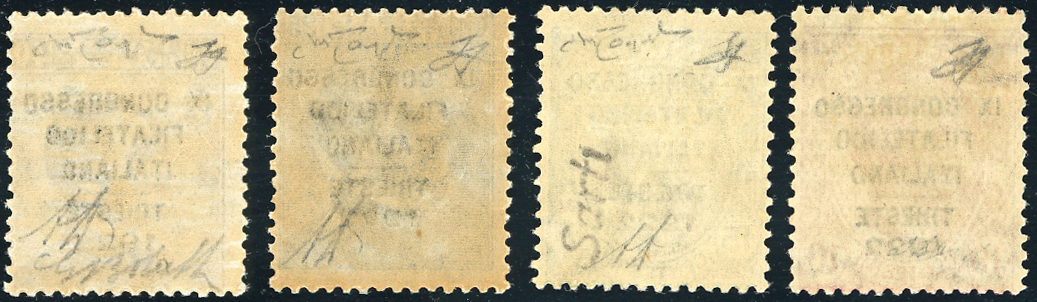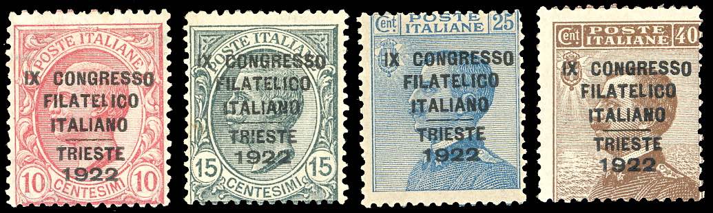 1922 - Congresso Filatelico, serie completa (123/126), gomma originale integra, perfetti. Tre valori Diena e Raybaudi, cert. Ferrario.