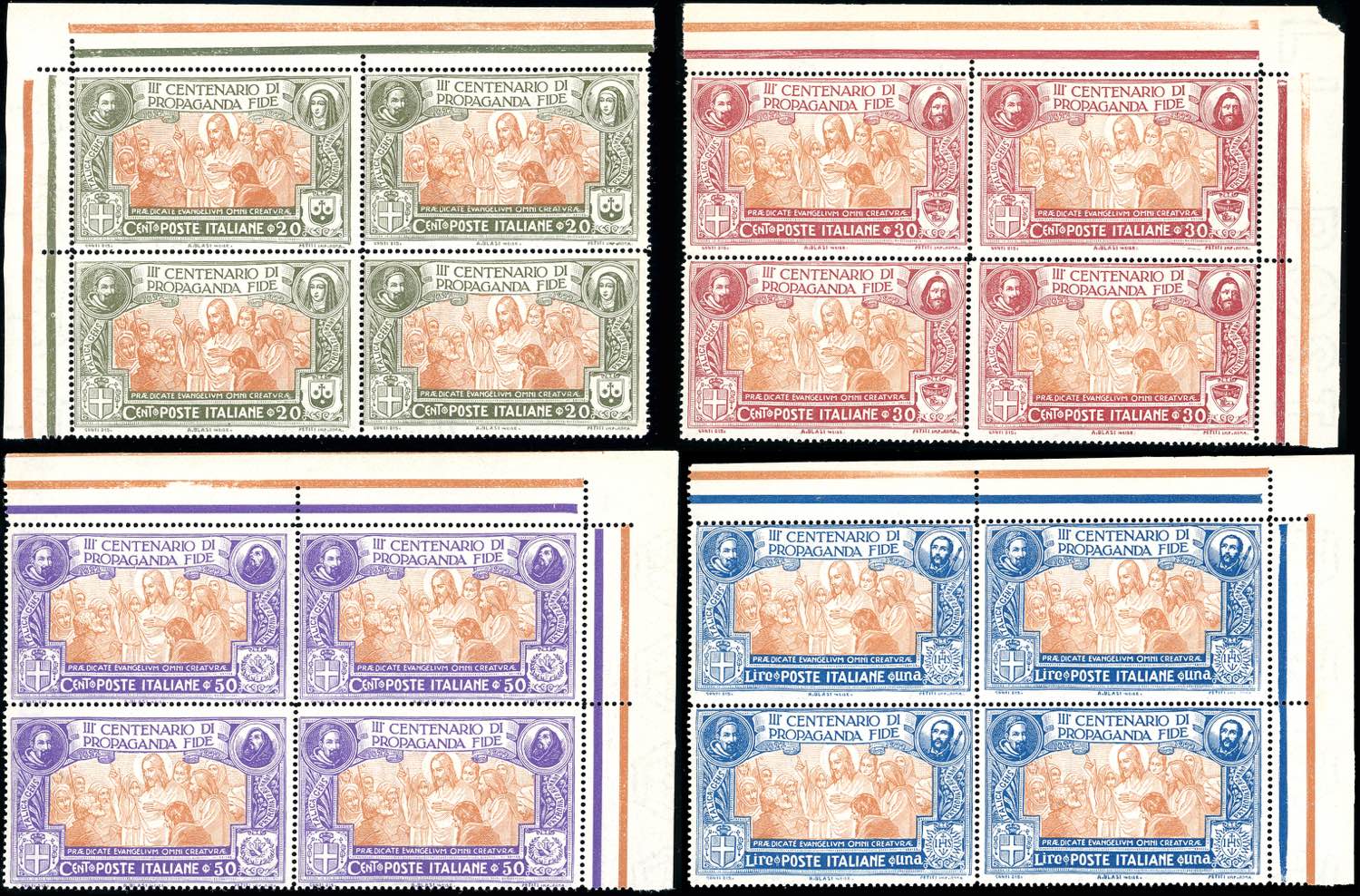 1923 - Propaganda Fide, serie completa (131/134), blocchi di quattro, angolo di foglio, gomma originale integra, perfetti. Belli.