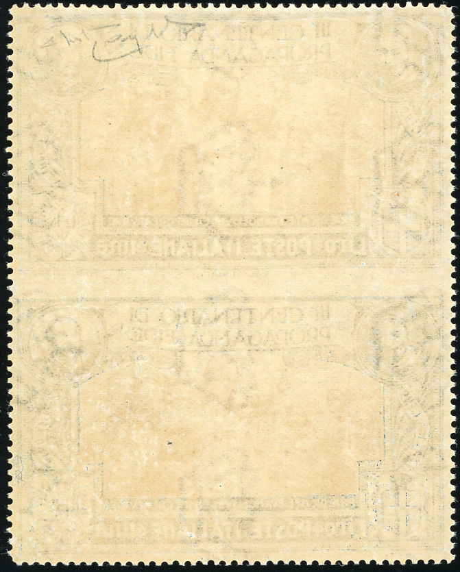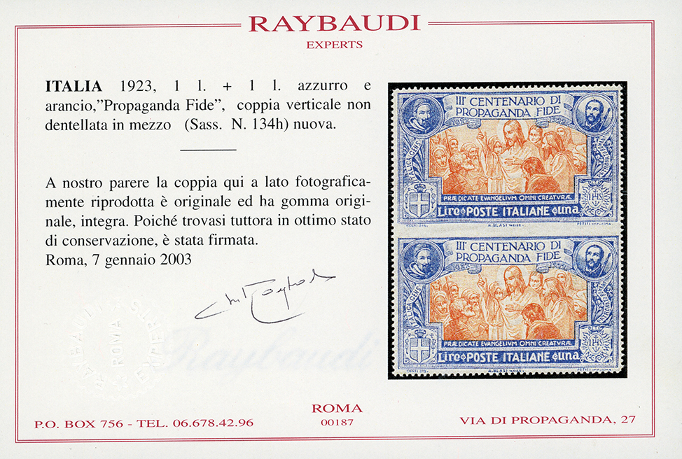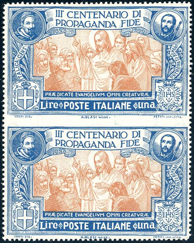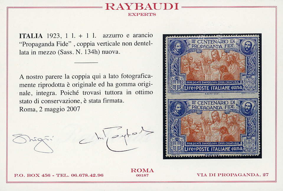 1923 - 1 lira Propaganda Fide, coppia verticale non dentellata al centro (134h), gomma originale integra, perfetta. Bella. Due cert. Raybaudi.