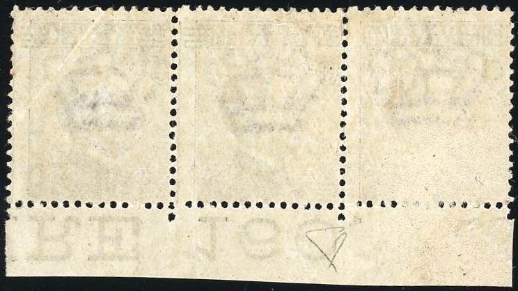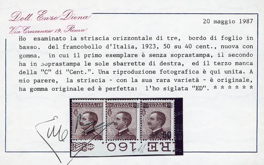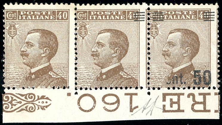 1923 - 50 cent. su 10 cent. (139), striscia orizzontale di tre, il primo esemplare senza soprastampa, il secondo con le sole sbarrette in ... Read more