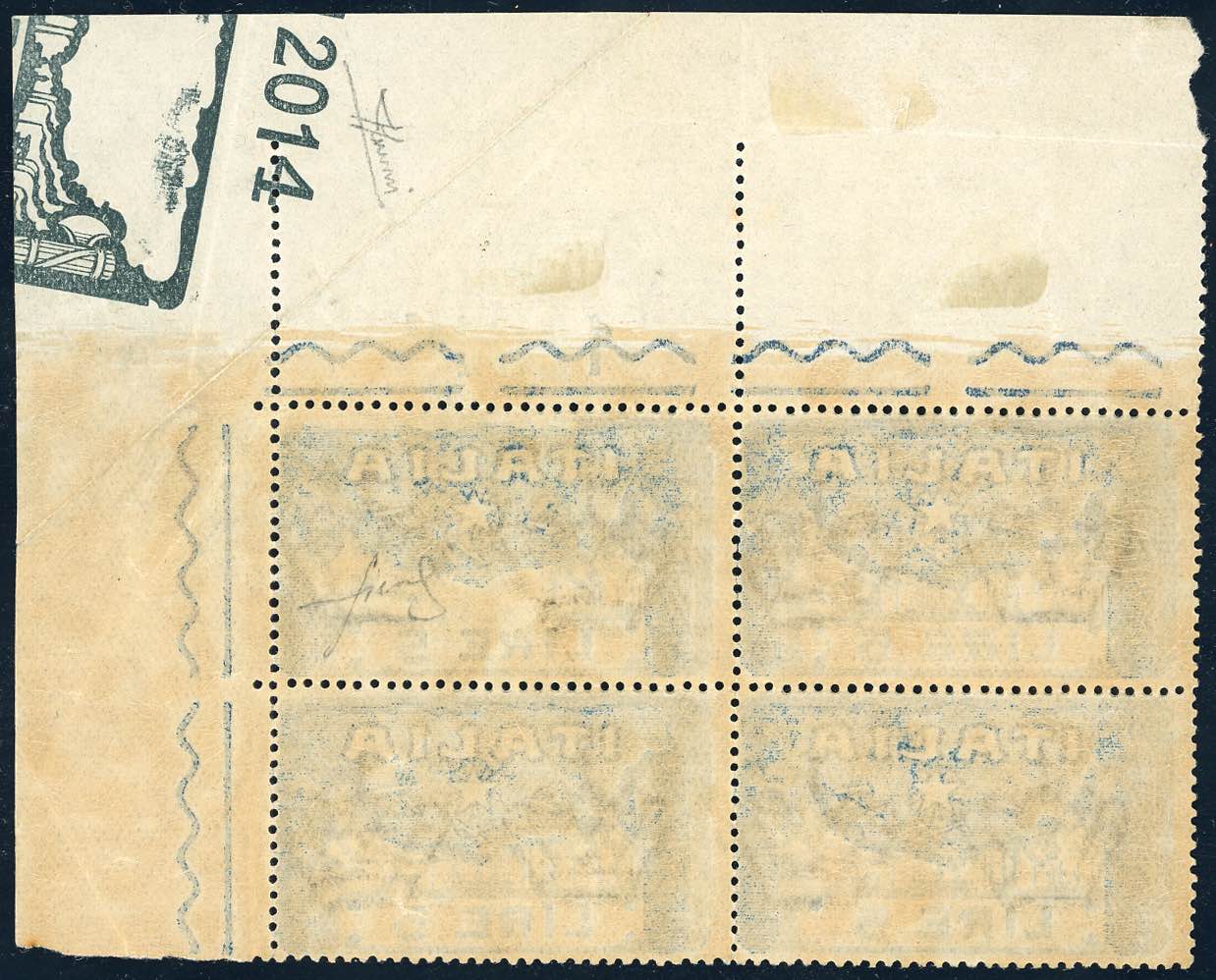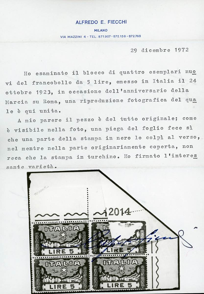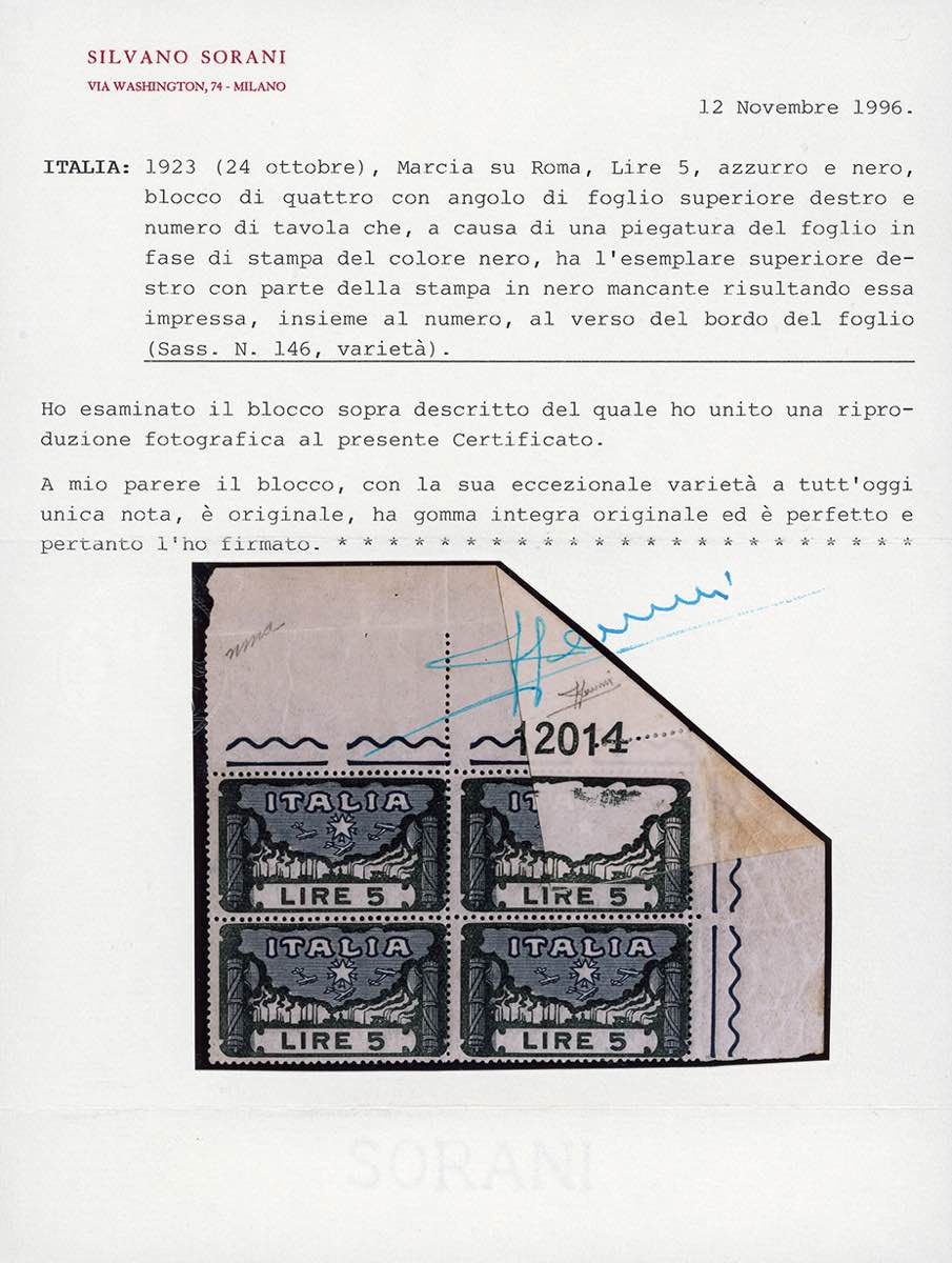 1923 - 5 lire Marcia su Roma, blocco di quattro, un esemplare con stampa del numero parzialmente mancante, impressa insieme al numero di tavola al verso dell'angolo di foglio, a causa di una piegatura al momento della stampa, gomma originale integra, perfetto. Splendida varietà, UNICA NOTA. Cert. Sorani e Fiecchi.