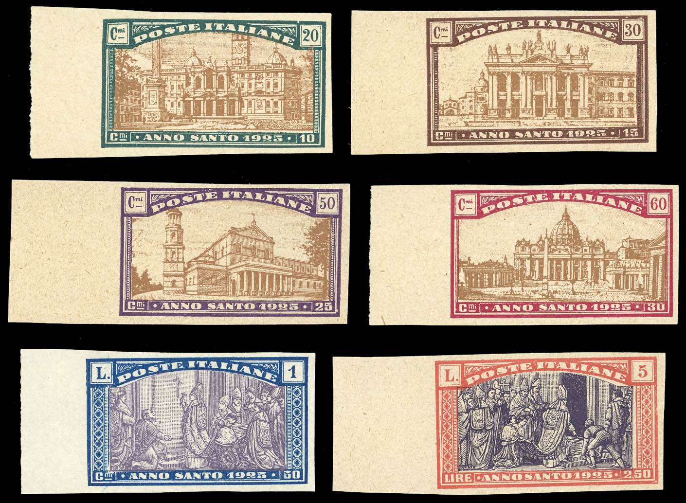 1924 - Anno Santo, prove di stampa della serie completa (169/174), non dentellate, bordo di foglio, senza gomma come sempre, perfette. Belle.