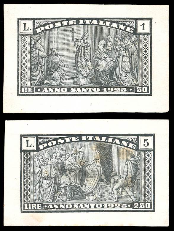 1924 - 1 lira + 50 cent., 5 + 2,50 lire Anno Santo (173,174) prove di conio in nero della cornice, sotto le quali sono state applicate le prove di conio in nero al centro, senza gomma come sempre, buono stato. Non comuni. Cert. E.Diena per il 5 lire.