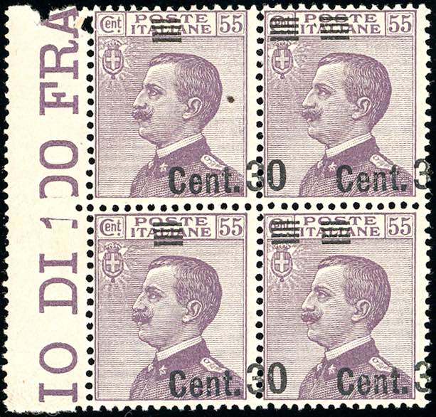 1924 - 30 cent. su 55 cent. Michetti, blocco di quattro con soprastampa spostata a destra, due esemplari con solo "cent.3" in soprastampa e ... Read more