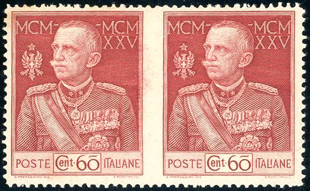 1925 - 60 cent. Giubileo, dent. 13 1/2, coppia orizzontale non dentellata al centro (186k), gomma originale, invisibile traccia di ... Read more