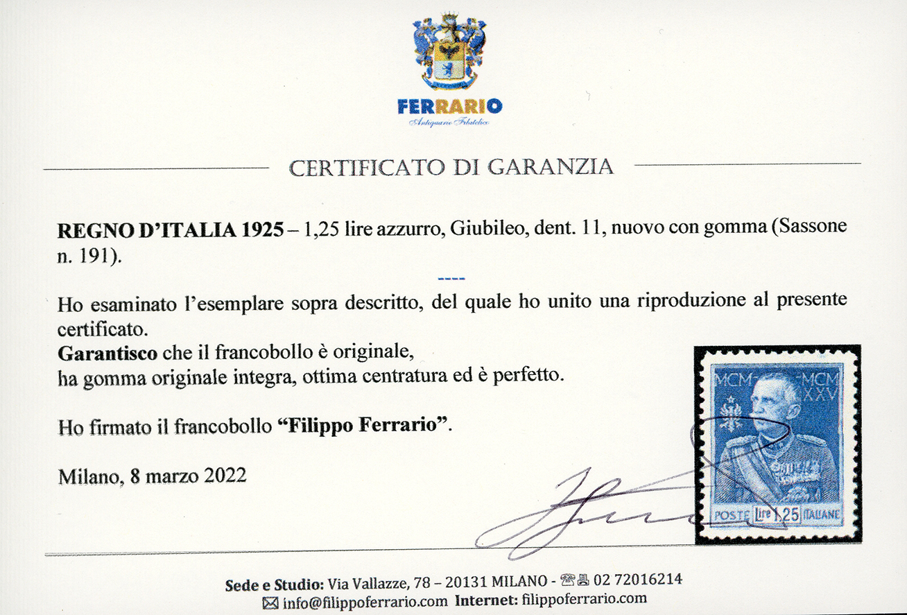 1926 - 1,25 lire Giubileo, dent. 11 (191), ottima centratura, gomma originale integra, perfetto. Splendido. Cert. Ferrario.