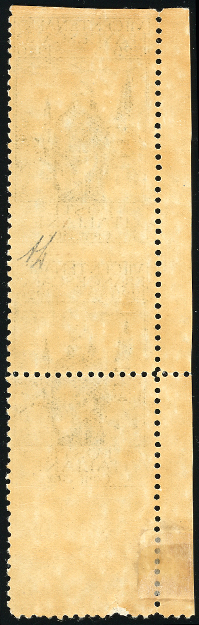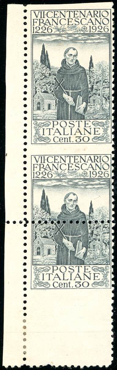 1926 - 30 cent. San Francesco, dent. 11 (198), coppia verticale non dentellata orizzontalmente e con la dentellatura orizzontale al centro del francobollo inferiore, angolo di foglio, gomma originale, integra per il primo esemplare, perfetta. Bella varietà non catalogata. A.Diena.