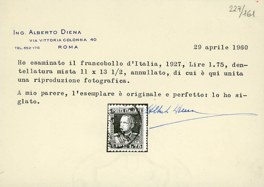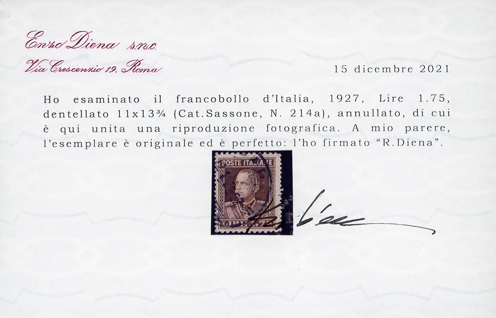 1927 - 1,75 lire Parmeggiani, dent. 11 x 13 3/4 (214a), usato, perfetto. Raro. Cert. Alberto e R.Diena.