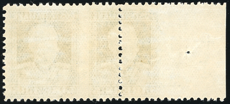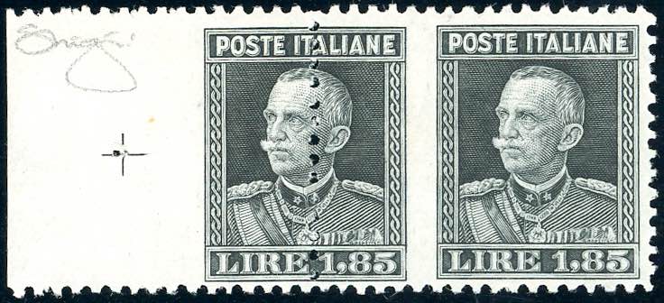 1927 - 1,85 lire Parmeggiani, coppia orizzontale non dentellata al centro e a sinistra e con una dentellatura all'interno del primo francobollo (215K), bordo di foglio, gomma originale integra, perfetta. Cert. Raybaudi.