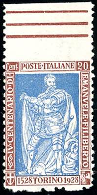 1928 - 20 cent. Emanuele Filiberto, dent. 11, non dentellato in alto (226K), bordo di foglio, gomma originale integra, perfetto.