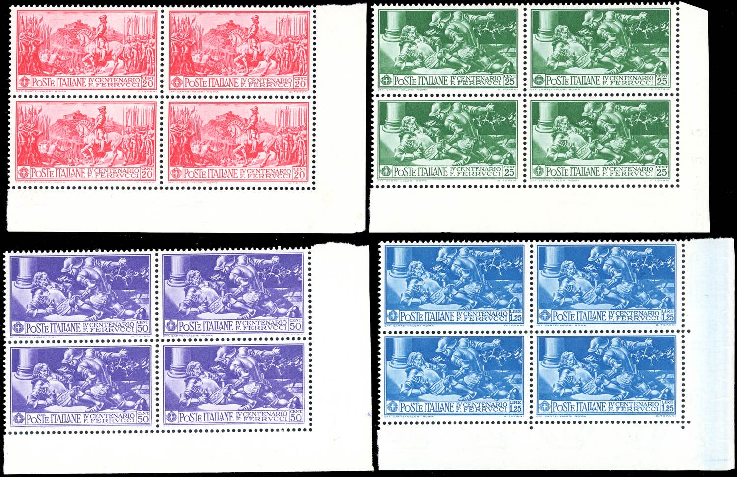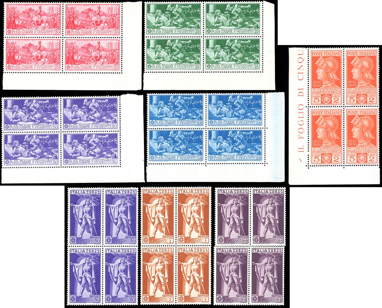 1930 - Ferrucci, serie completa (276/280+A), blocchi di quattro, angolo di foglio, gomma originale integra, perfetti. Belli.