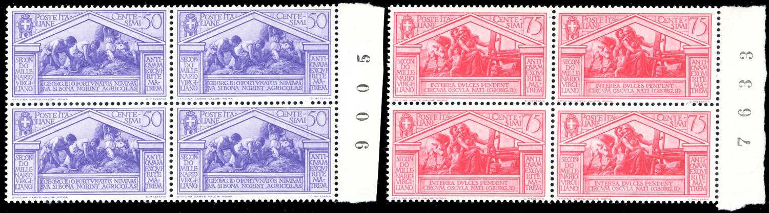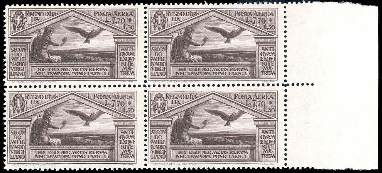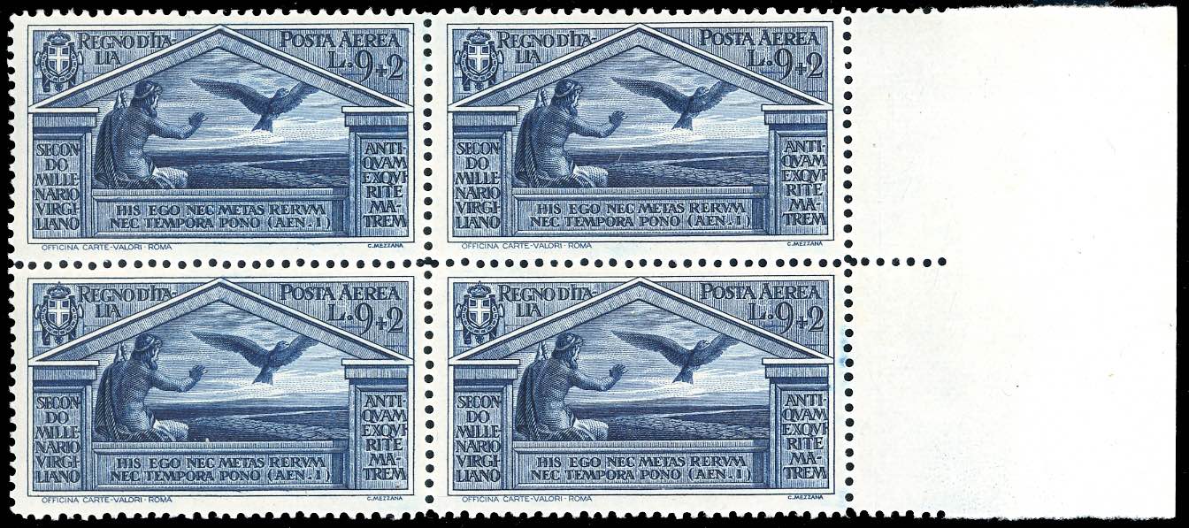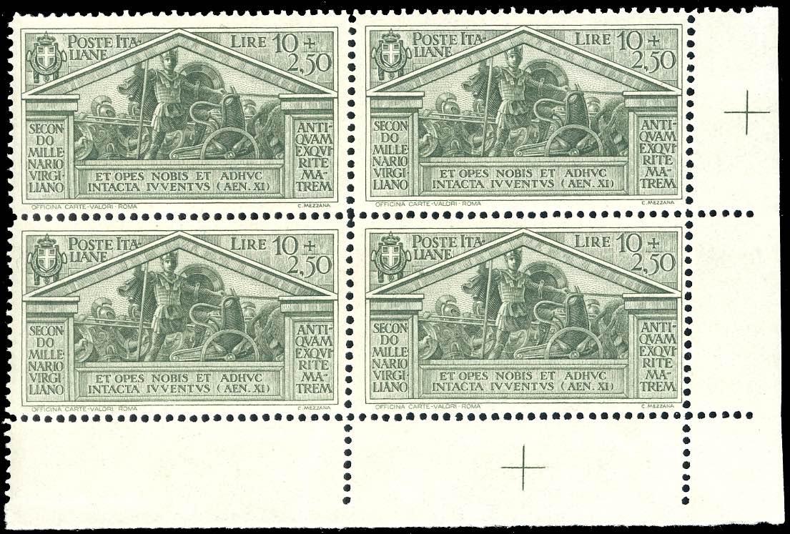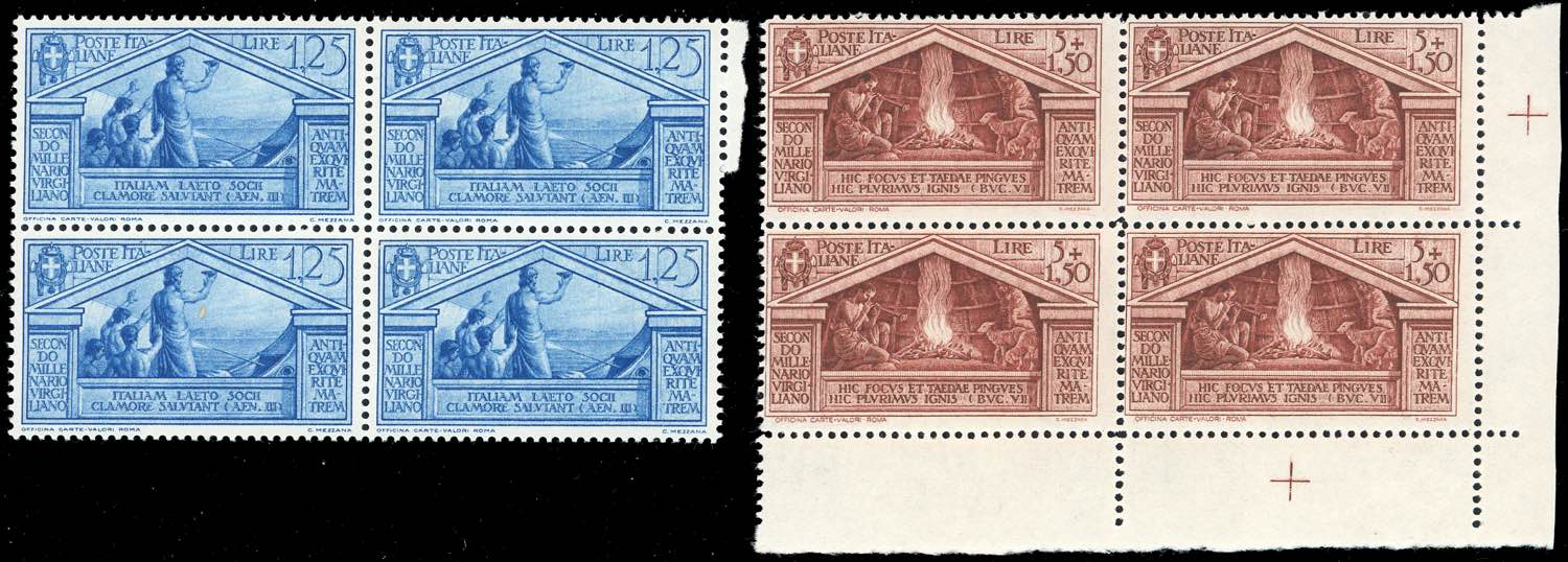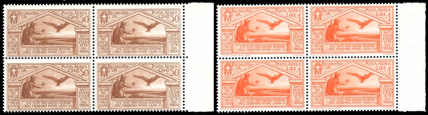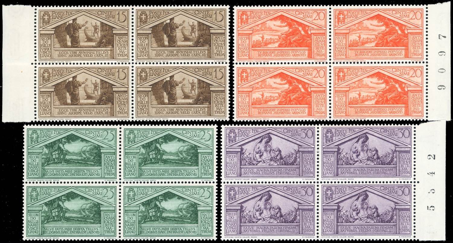 1930 - Virgilio, serie completa (282/292+A), blocchi di quattro, bordo/angolo di foglio, gomma originale integra, perfetti. Ottima qualità.