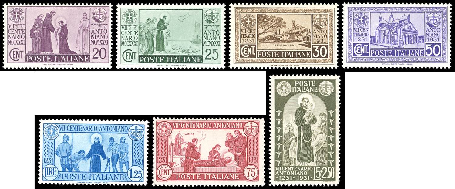 1931 - S. Antonio, dent. 14, serie completa di 7 valori (292/298), gomma originale integra, perfetti. Freschissimi.