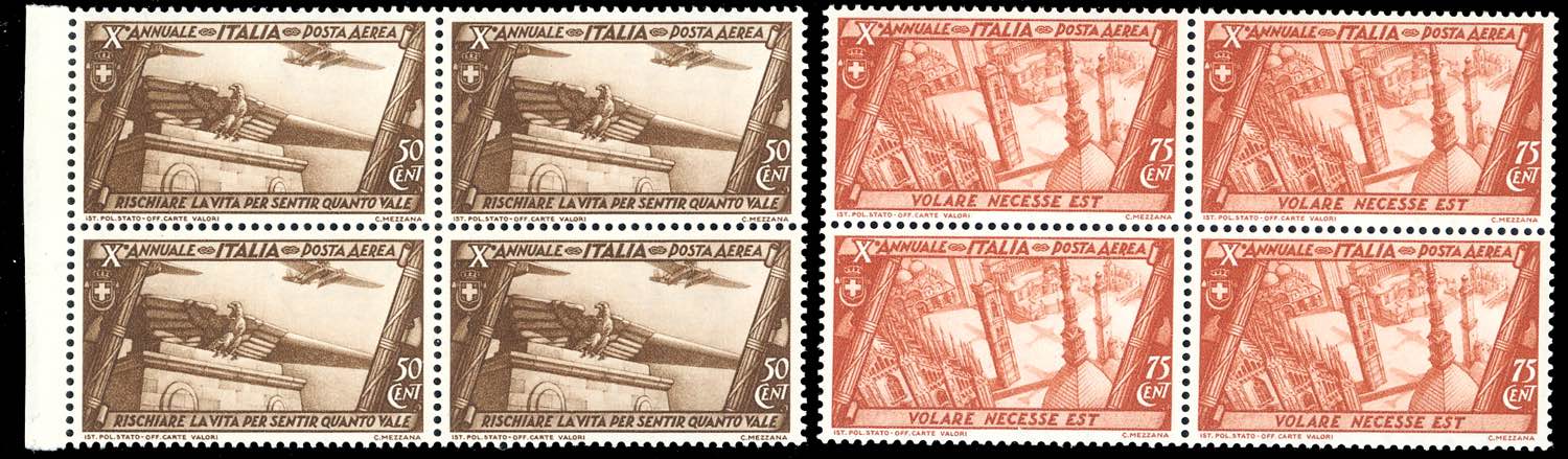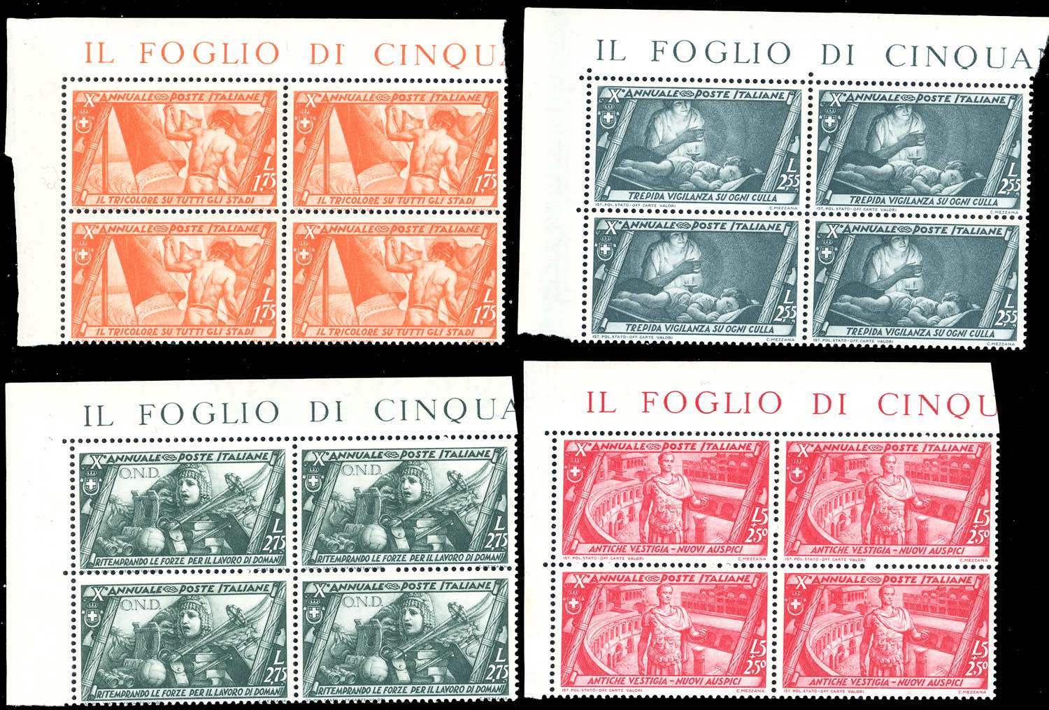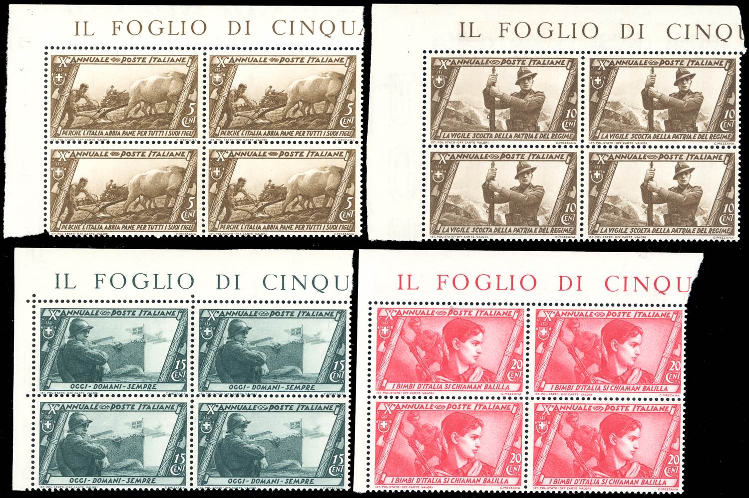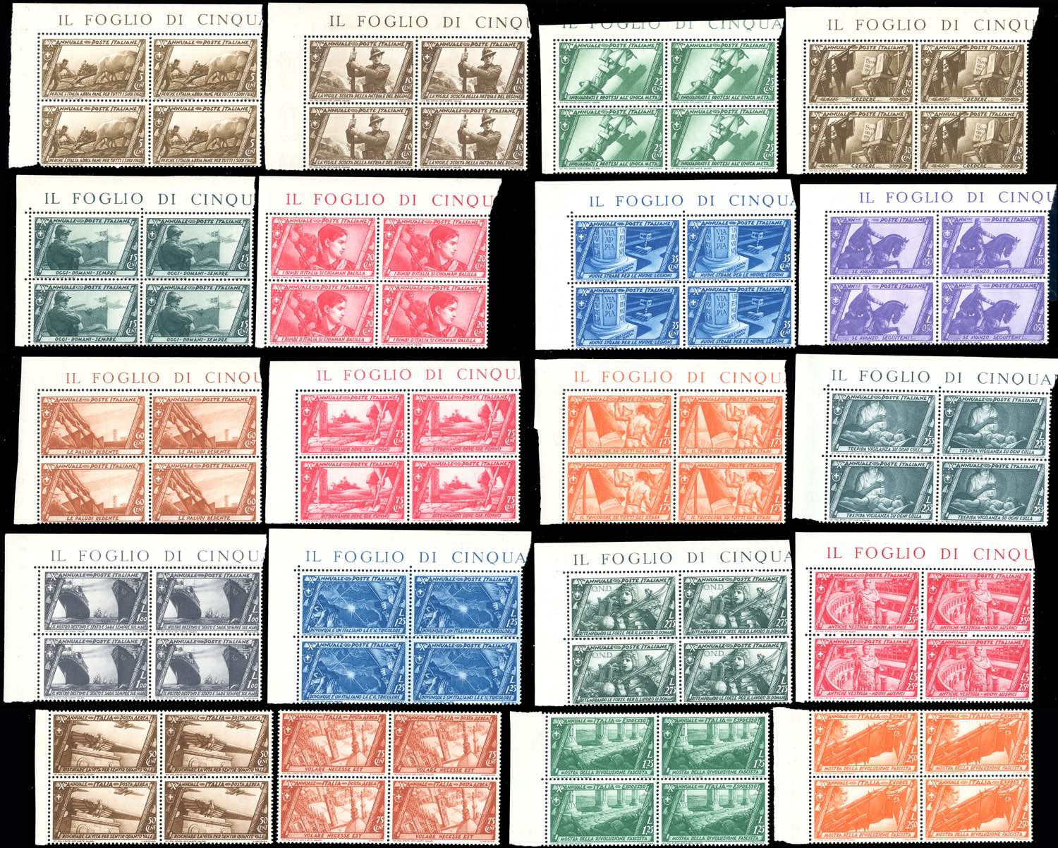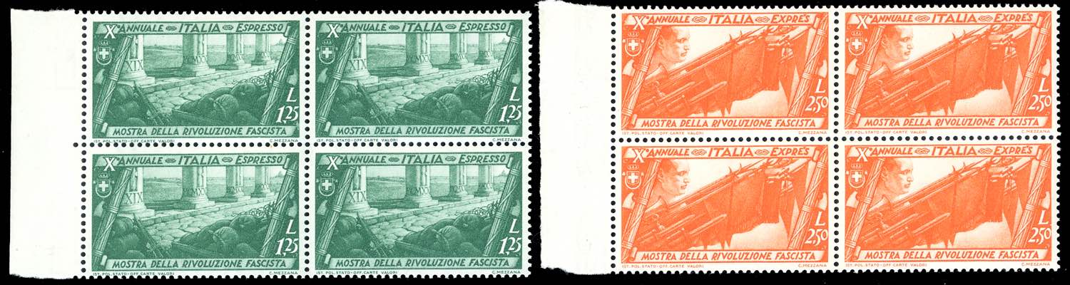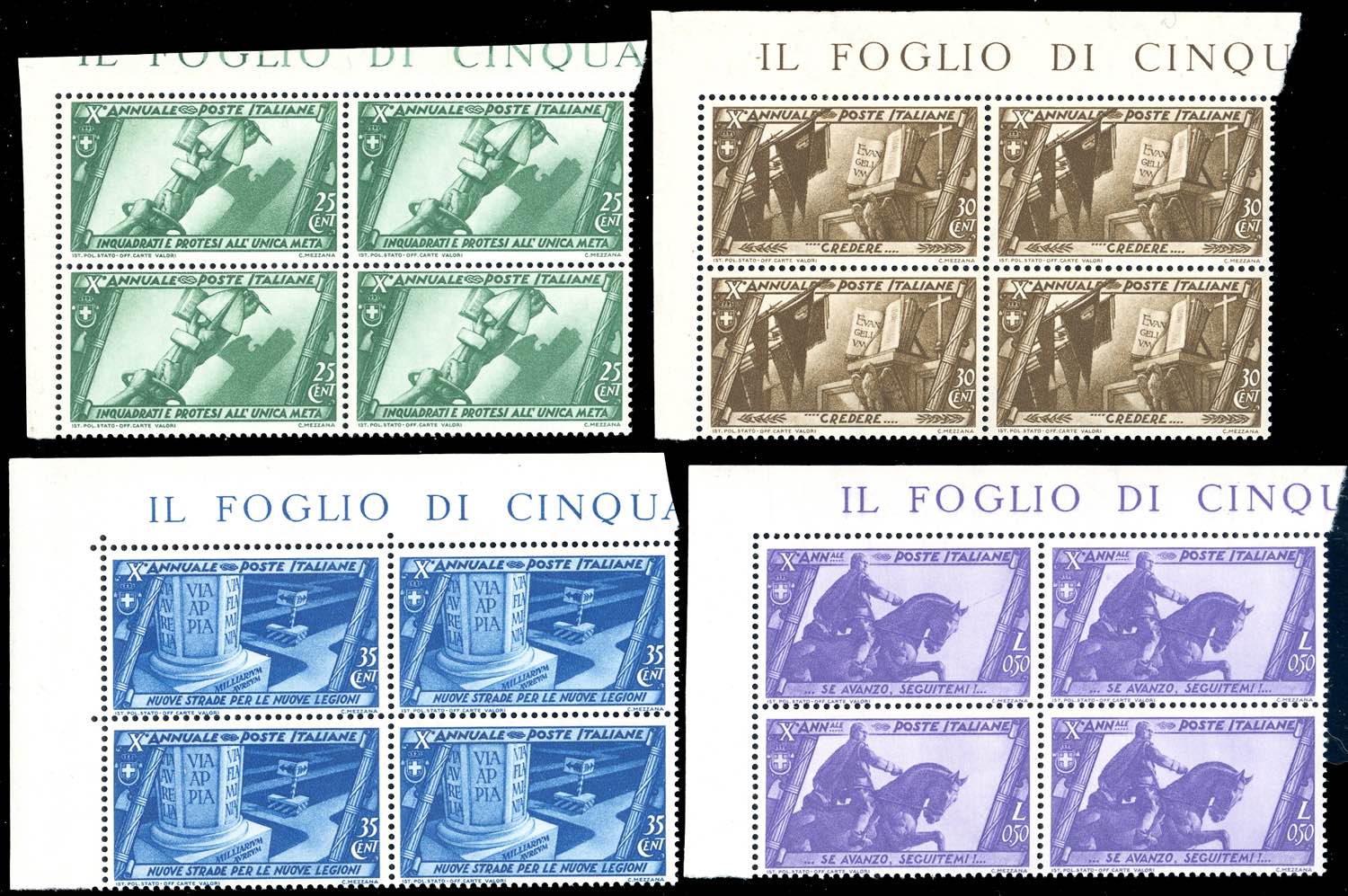 1932 - Marcia su Roma (325/340+A+E), blocchi di quattro, bordo o angolo di foglio, gomma originale, integra, perfetti. Bellissimi.
