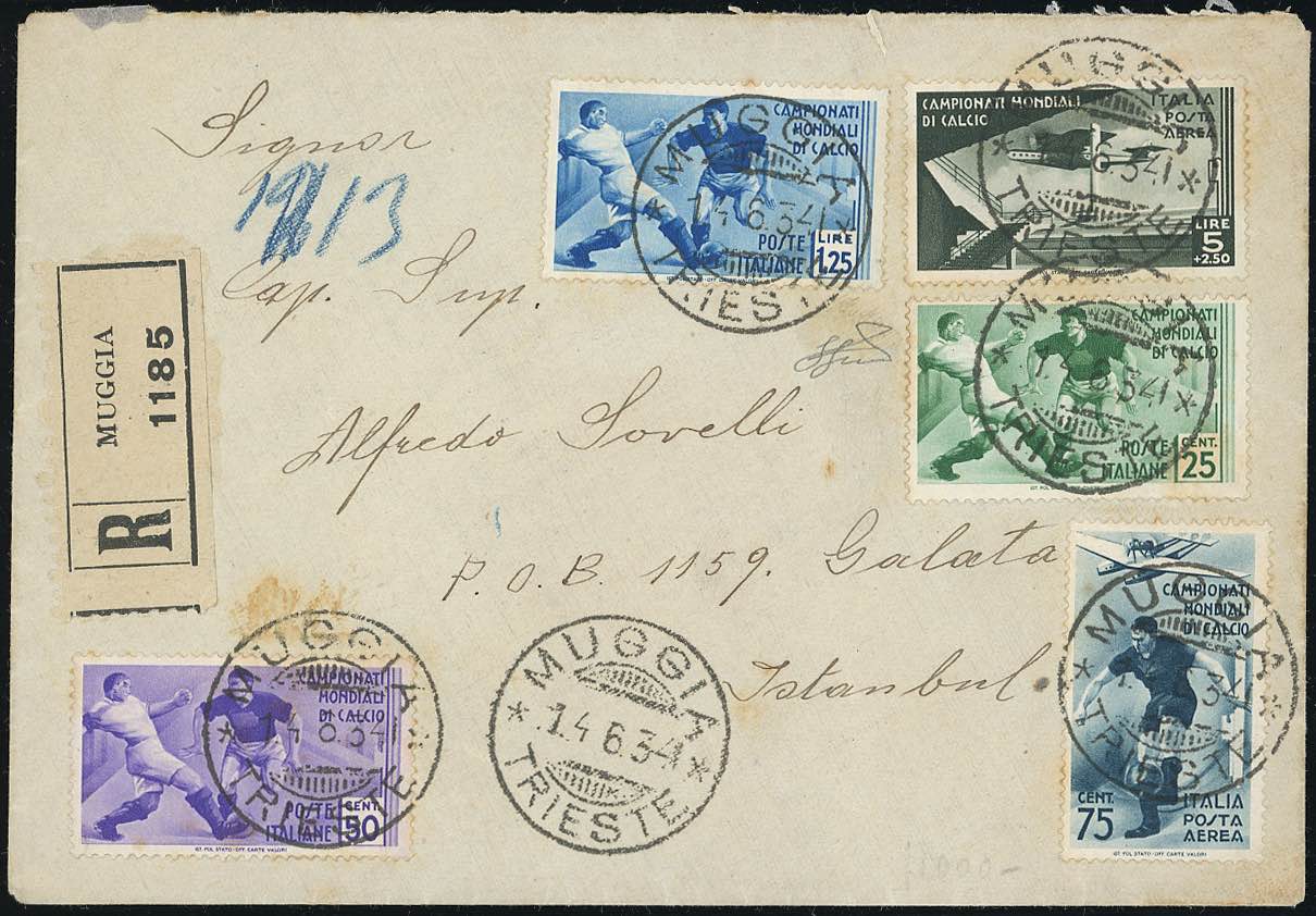 1934 - 25 cent., 50 cent., 1,25 lire e 75 cent., 5+2,50 lire posta aerea Mondiali di Calcio (358/360,A70/71), perfetti, su busta raccomandata da Muggia 14/6/1934 ad Istanbul. Rarissima affrancatura e destinazione per questa emissione. Ferrario.
