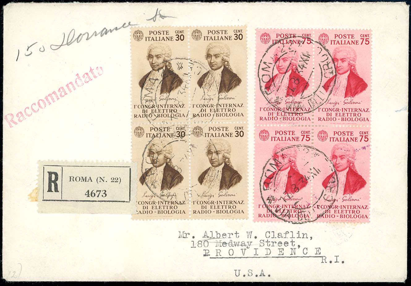 1934 - 30 cent. e 75 cent. Galvani (364/365), blocchi di quattro, perfetti, su busta raccomandata da Roma 17/8/1934 per gli Stati Uniti, ... Read more