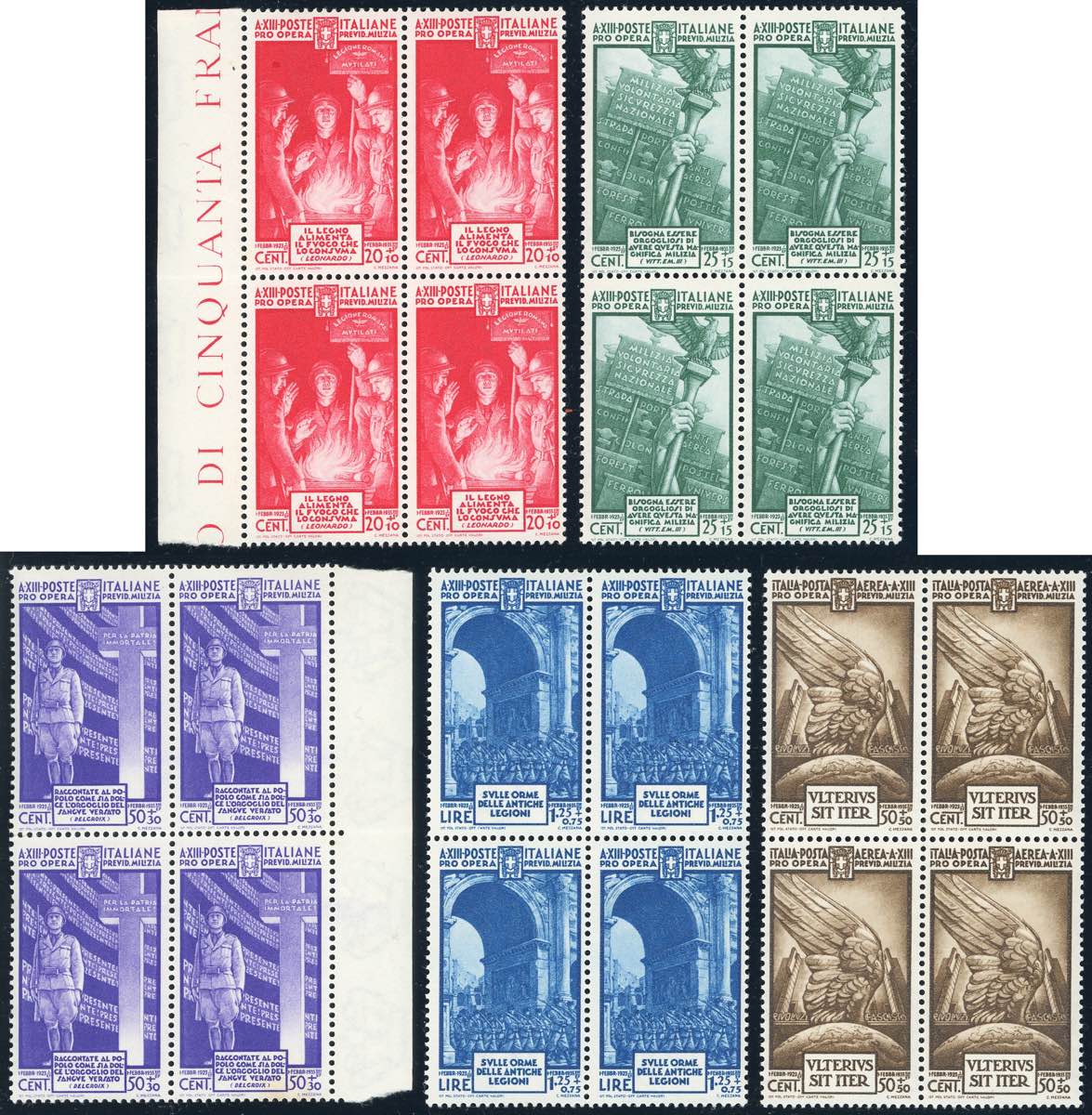 1935 - Milizia IV emissione, serie completa (380/383+A), blocchi di quattro, gomma originale integra, perfetti. Bellissimi. Ferrario.