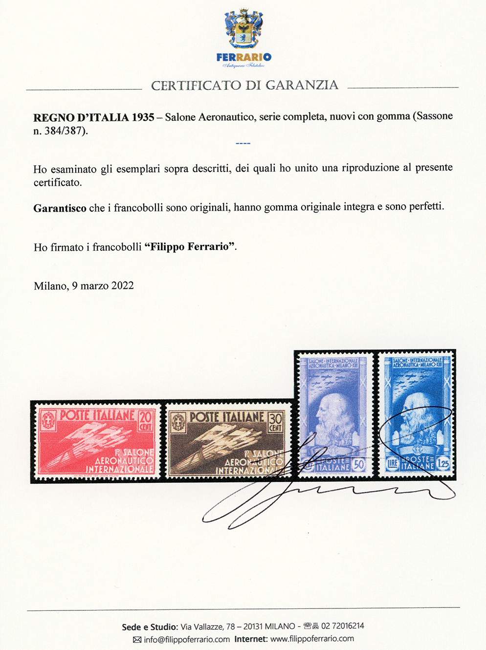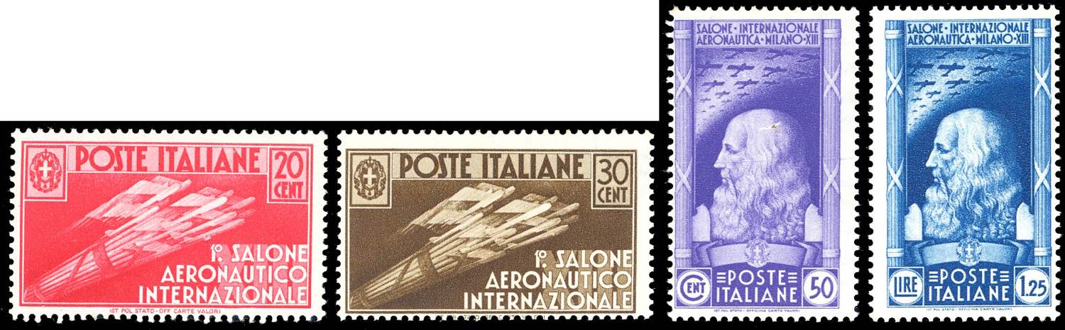 1935 - Salone aeronautico (384/387), gomma originale integra, perfetti. Cert. Ferrario.