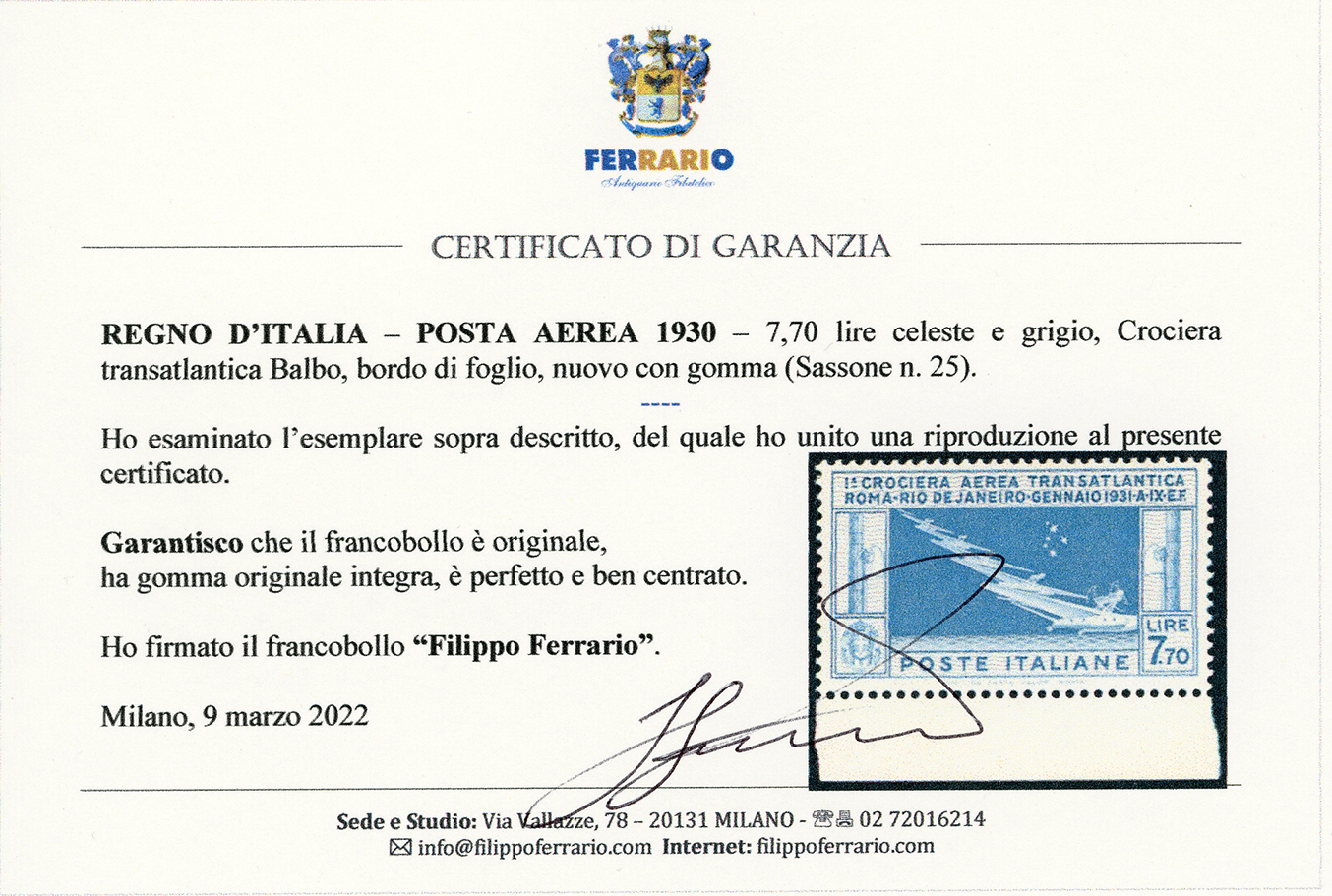 1930 - 7,70 lire Crociera Balbo (25), bordo di foglio, gomma originale integra, perfetto. Cert. Ferrario.
