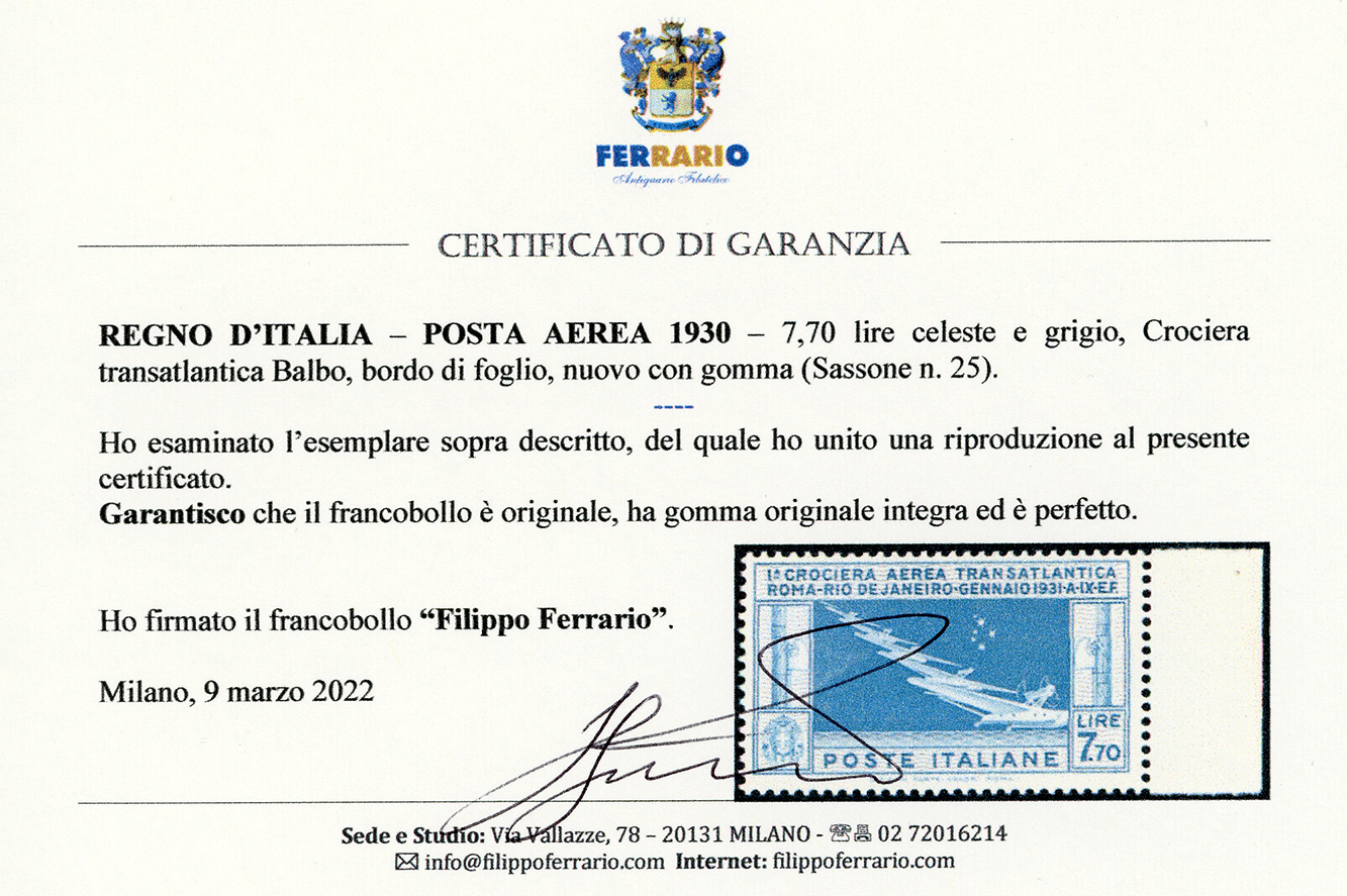 1930 - 7,70 lire Crociera Balbo (25), bordo di foglio, gomma originale integra, perfetto. E.Diena, cert. Ferrario.