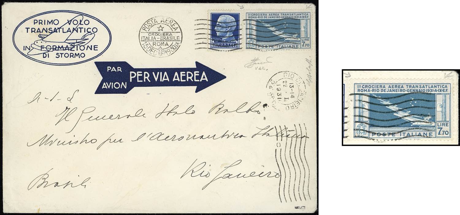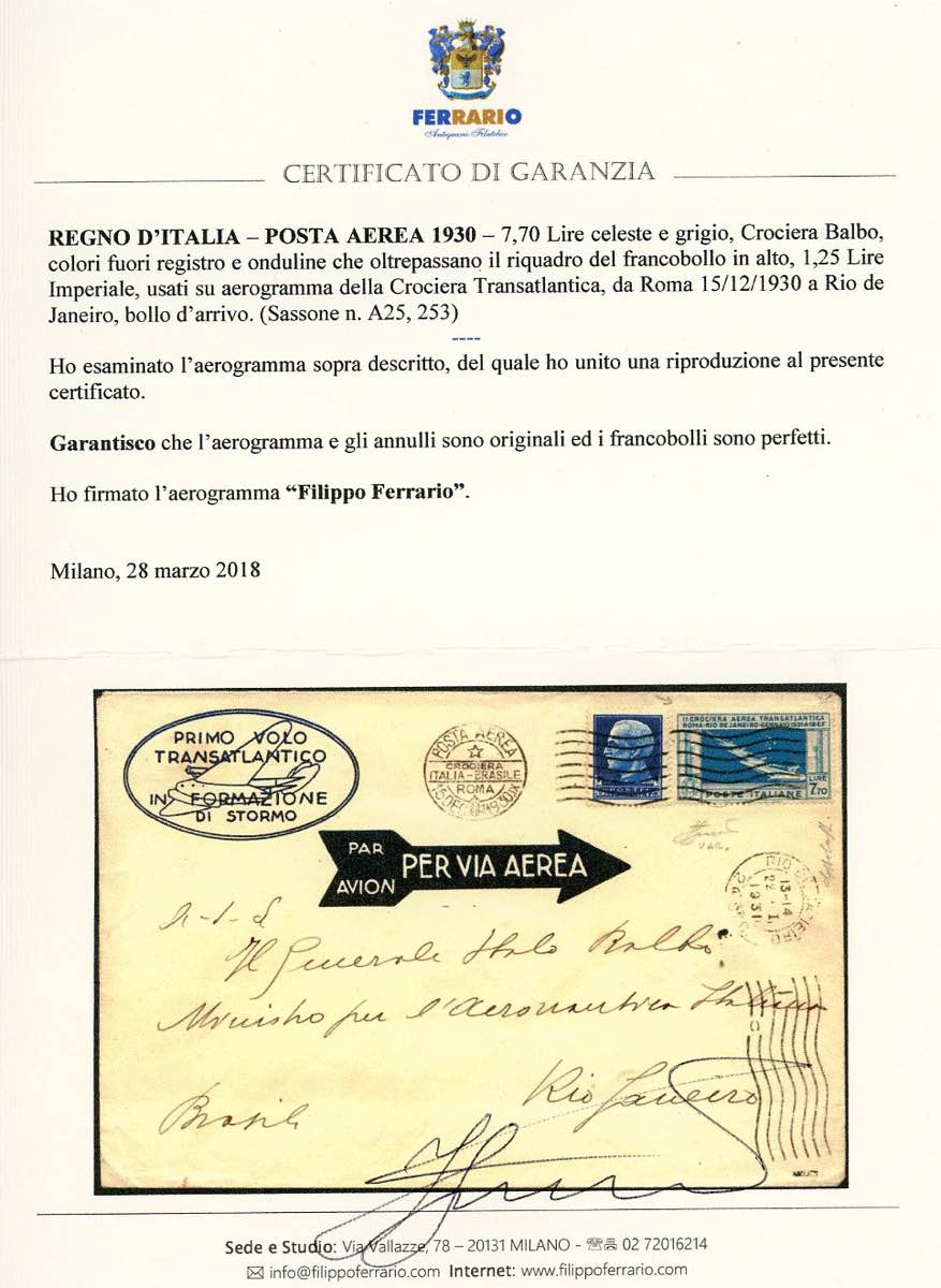1930 - Aerogramma della Crociera Transatlantica di Balbo da Roma 15/12/1930 a Rio de Janiero, affrancato con 1,25 lire Imperiale e 7,70 l. Balbo, COLORI FUORI REGISTRO e onduline che oltrepassano il riquadro del francobollo in alto (293,A25), perfetti. Bella varietà non catalogata. G.Bolaffi. Cert. Ferrario.
