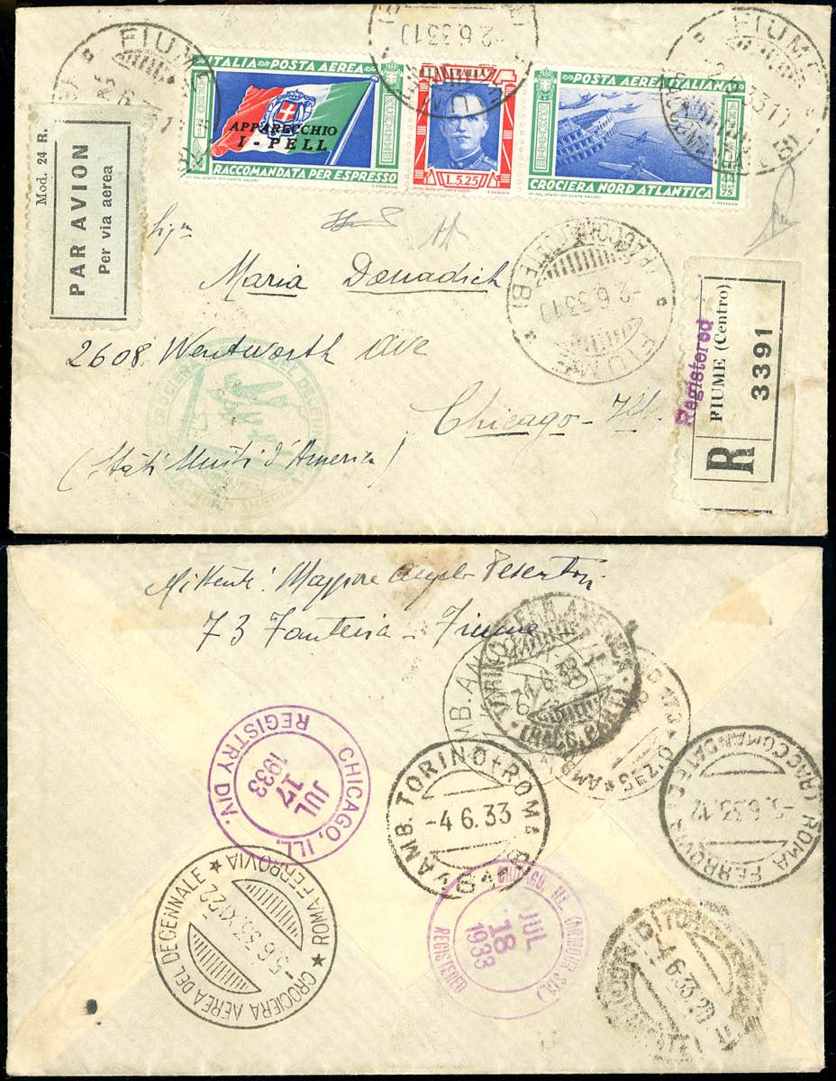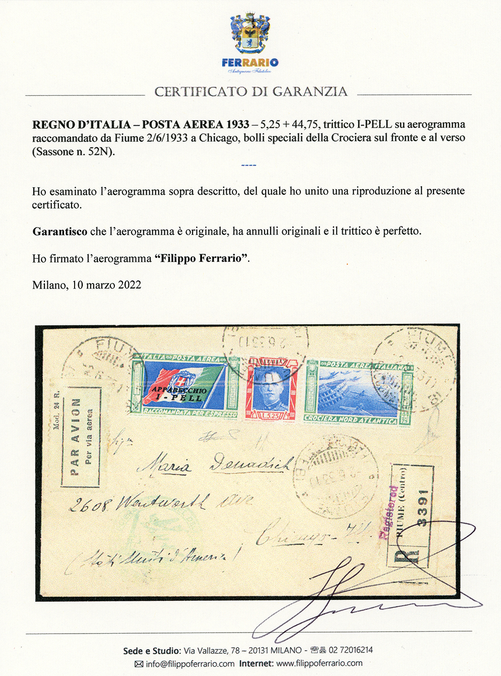 1933 - 5,25 + 44,75 lire Trittico I-PELL (52N), perfetto, su aerogramma raccomandato da Fiume 2/6/1933 a Chicago, bolli speciali della Crociera sul fronte e al verso. Molto interessante per la località di partenza. A.Diena, cert. Ferrario.