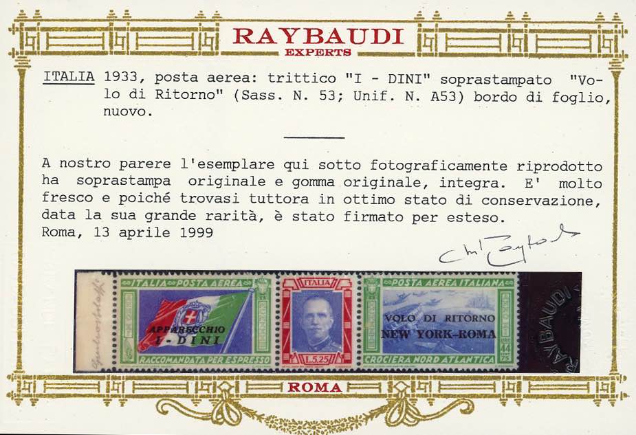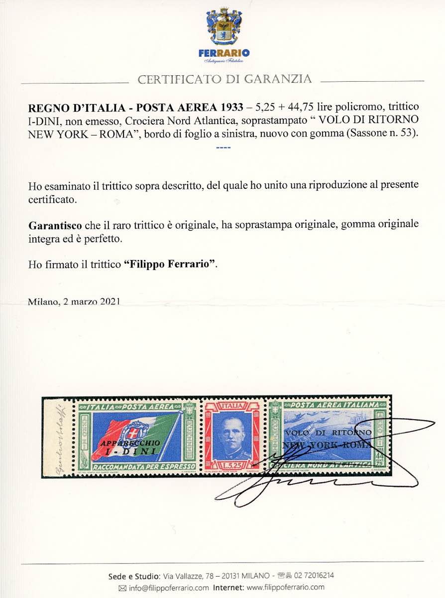 1933 - 5,25 + 44,75 lire, Trittico I-DINI, soprastampato "Volo di Ritorno" (53), bordo di foglio, gomma originale integra, perfetto e ben centrato. Bellissimo. Giulio Bolaffi, cert. Oro Raybaudi e Ferrario.