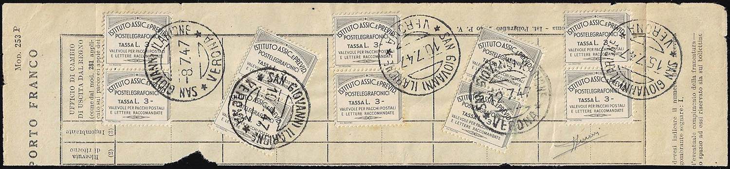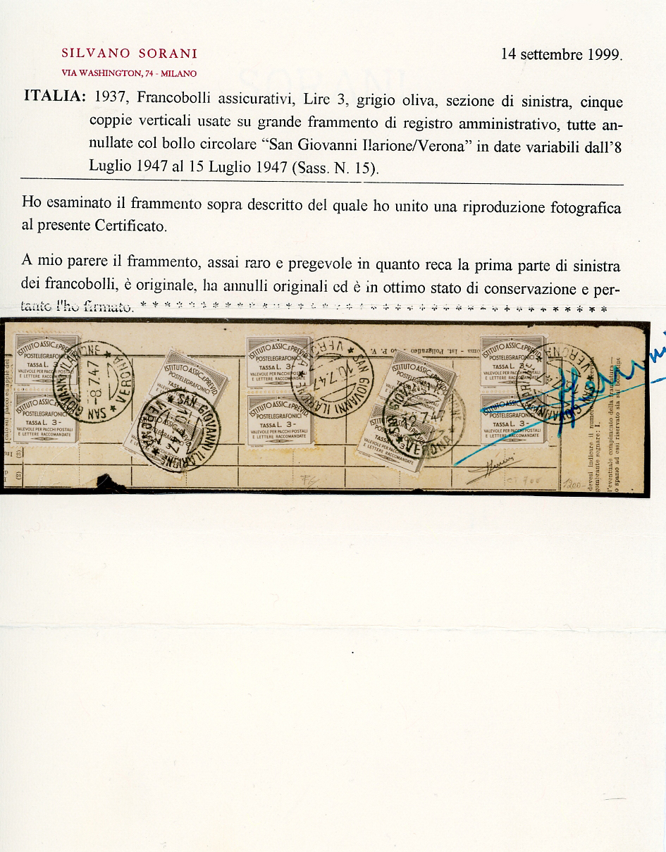 1947 - 3 lire Previdenza Postelegrafonici, I parte (15), cinque coppie, perfette, usate su ampio frammento a San Giovanni Ilarione con annulli dall'8 al 15 luglio 1947. Rara affrancatura multipla! Cert. Sorani.
