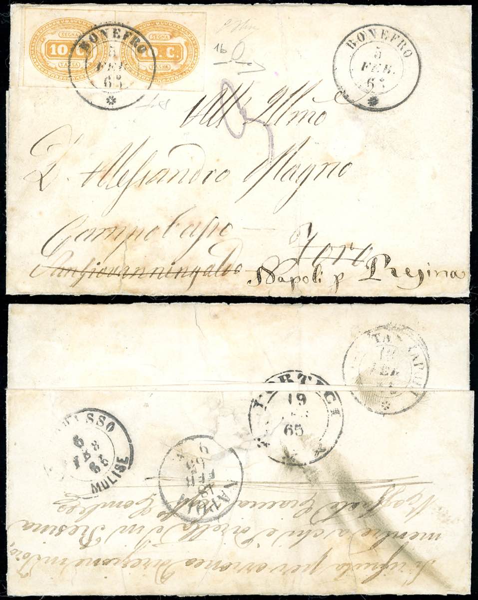 1865 - 10 cent. arancio, coppia orizzontale (1b), perfetta, USATA COME FRANCOBOLLO su sovracoperta di lettera, sapientemente restaurata, da Bonefro 5/2/1865 a Toro, rifiutata e spedita a Resina e tassata 30 cent. Si tratta di uno dei pochissimi casi noti in cui i segnatasse furono utilizzati come francobolli ordinari. Rarità del settore. G.Oliva, cert. Manzoni e Fiecchi.