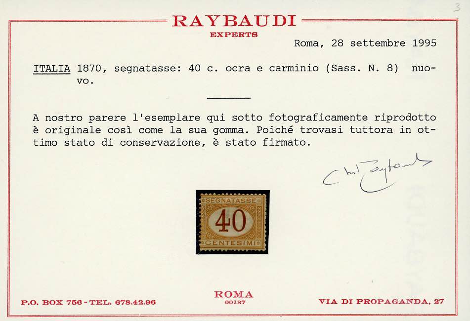 1870 - 40 cent. ocra e carminio (8), buona centratura, gomma originale, perfetto. Molto fresco. Cert. Raybaudi.
