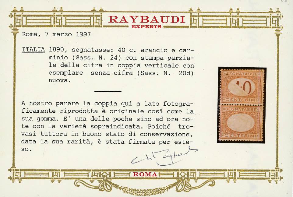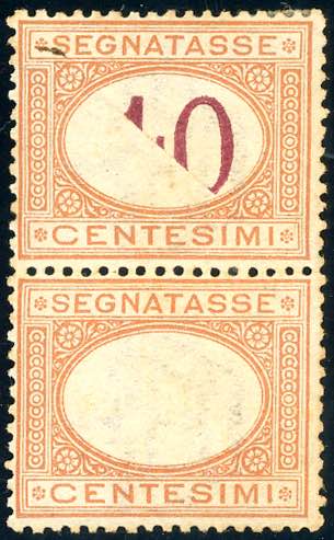 1890 - 40 cent. arancio e carminio, coppia verticale, un esemplare senza cifra, l'altro con cifra parziale a causa di una piega del foglio ... Read more