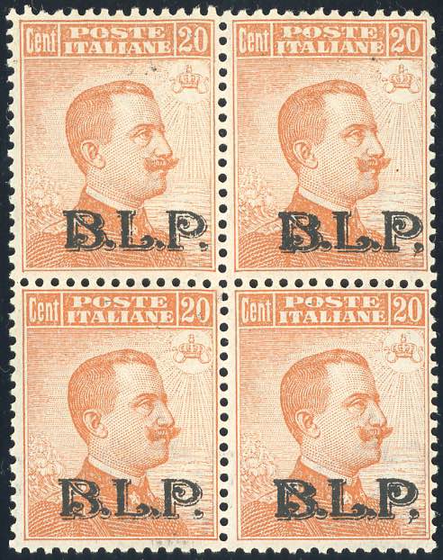 1922 - 20 cent., soprastampa nera BLP del II tipo, blocco di quattro, due esemplari con virgola anziché punto la "P" (7A,7Aga), gomma ... Read more