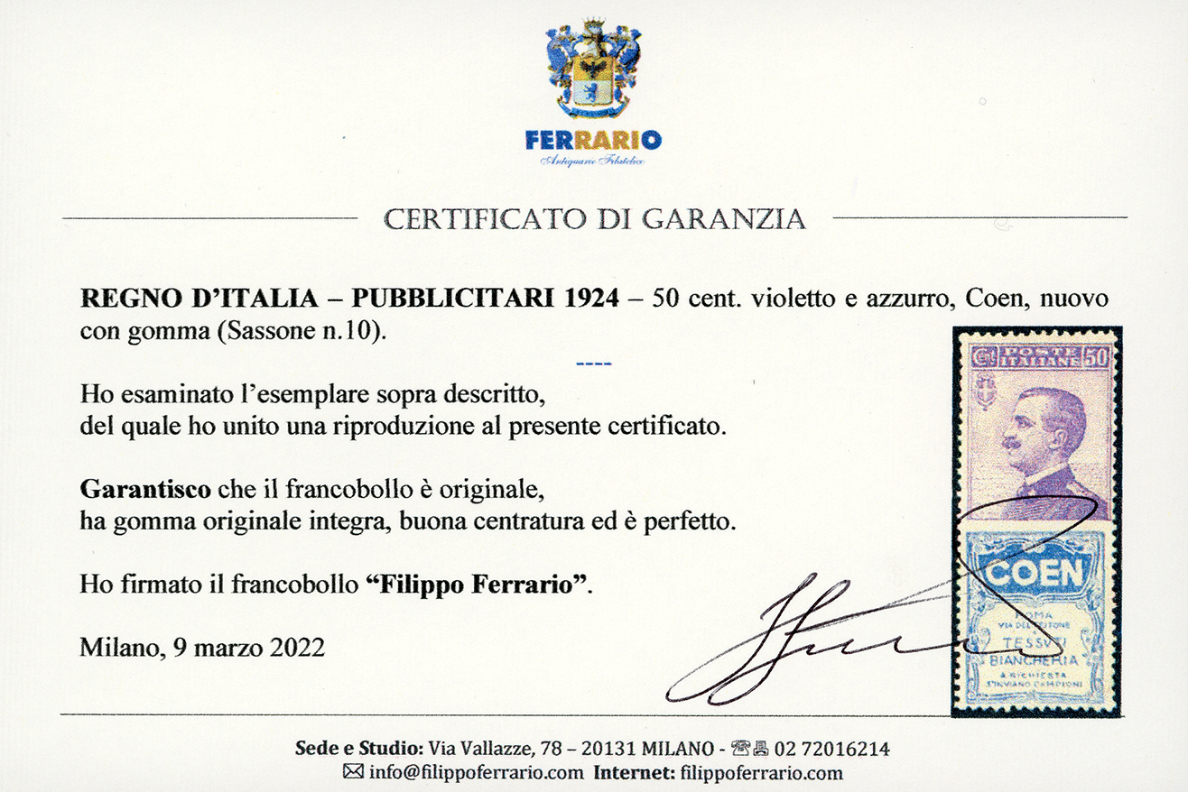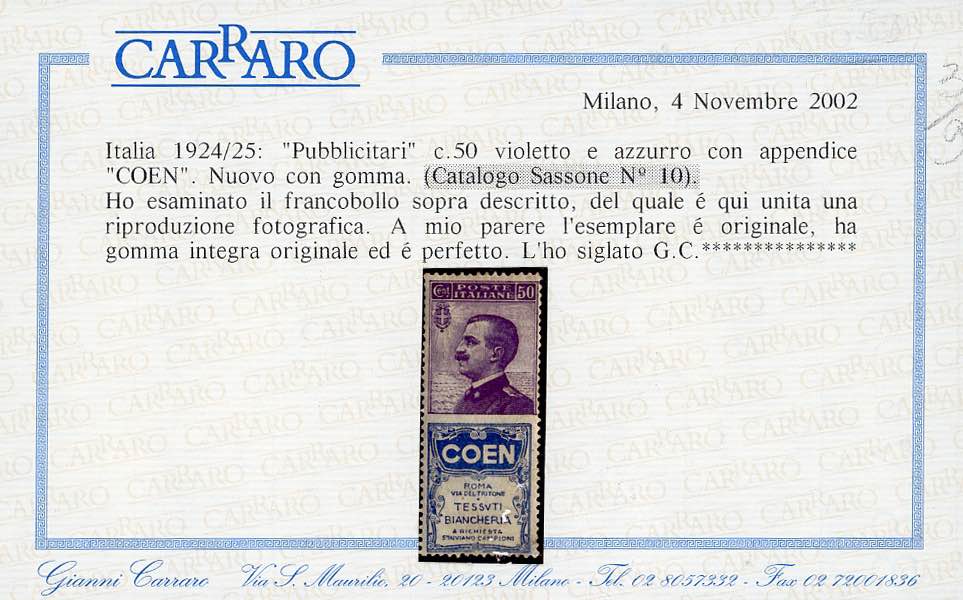 1924 - 50 cent. Coen (10), nuovo, gomma originale integra, perfetto e ben centrato. Molto fresco. Cert. Carraro e Ferrario.